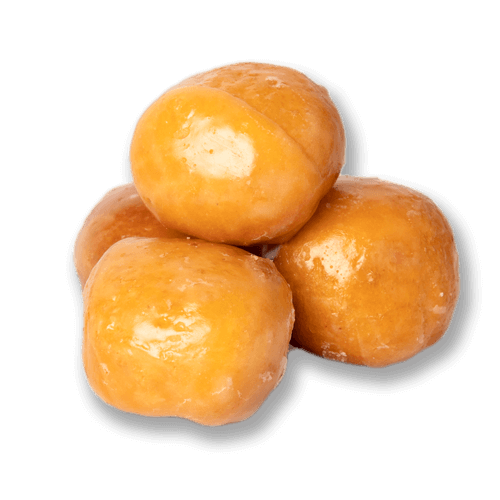 Glazed raised doughnut filled with Bavarian cream and topped with ultra-crispy caramelized sugar