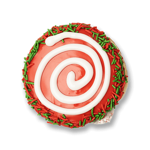 Red frosted raised doughnut filled with candy cane cheesecake and topped with white swirl décor and holiday sprinkles