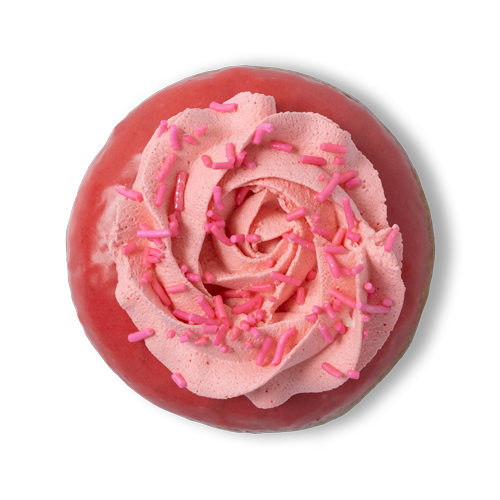 White frosted doughnut filled with strawberry jam, topped with sprinkles and strawberry drizzle