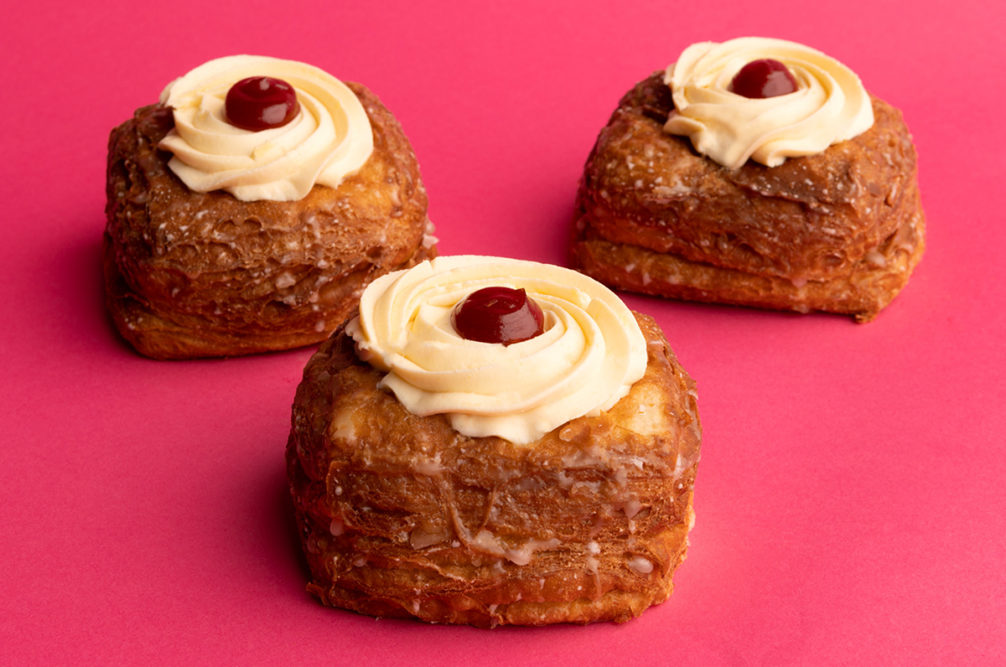 The El Guzman DoughCro is a croissant doughnut filled with guava and topped with a sweet cheese rosette and a dollop of guava. It can be purchased at all Pinkbox Doughnut locations in Southern Nevada.