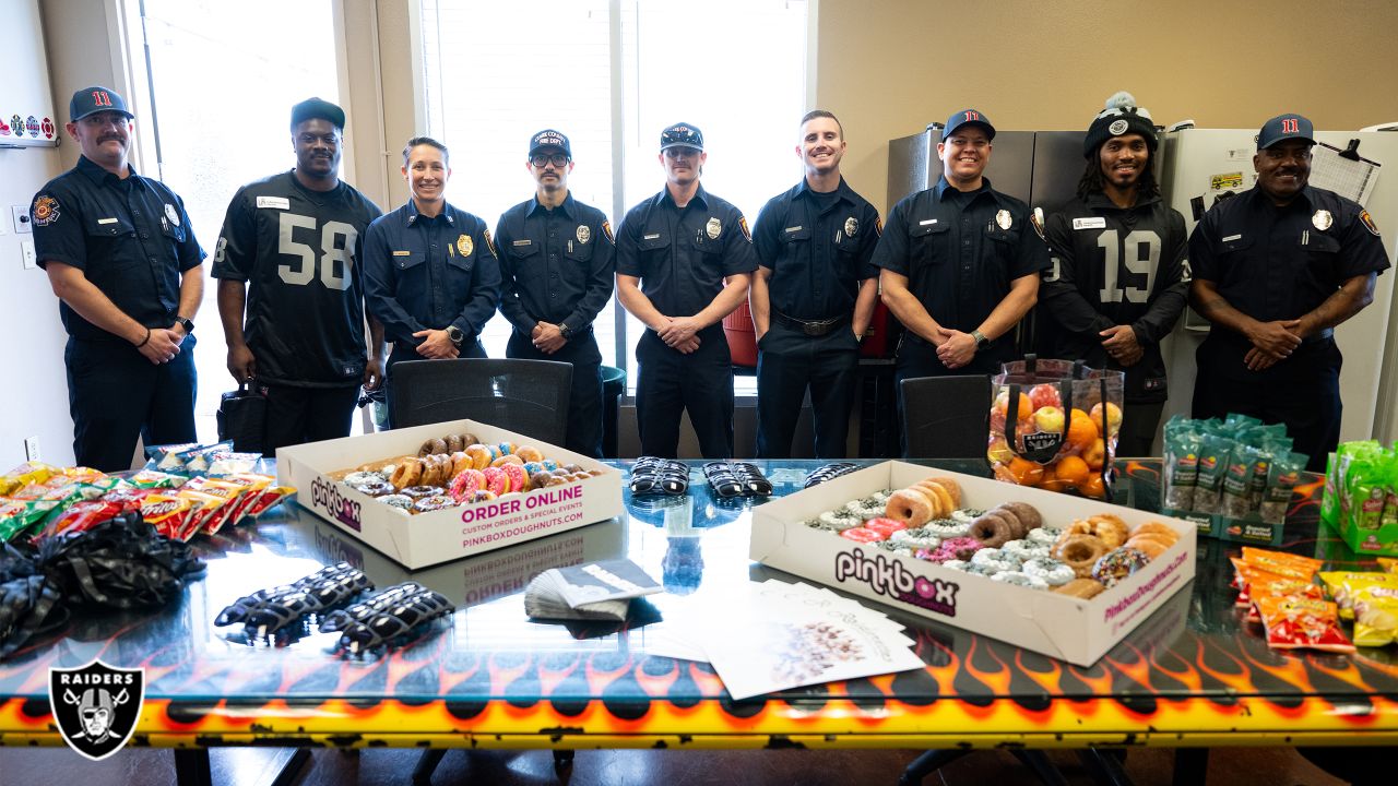 Silver & Black visited Las Vegas Metropolitan Police Department Headquarters (LVMPD), American Medical Response, Community Ambulance, Clark County Fire Department (CCFD) Station 11, Las Vegas Fire & Rescue, Henderson Fire Department, Henderson Police Department, Nevada State Police, North Las Vegas Fire Department, and North Las Vegas Police Department, to express gratitude for their day-to-day involvement within the community. Throughout the day, Raiders staff distributed Raiders-themed giveaways as well as food from Pinkbox Doughnuts, Frito-Lay, and Melissa’s Produce to those entities that serve.